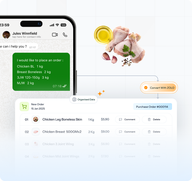 ZOLO is the #1 AI Partner for food suppliers. It uses industry specific AI technology to streamline B2B order processing, reducing time and errors by over 90% where unstructured customer orders are converted to structured ERP records in seconds. Best part, suppliers can maintain their customers’ existing ordering behaviours (e.g., via WhatsApp or Email) with no changes required.